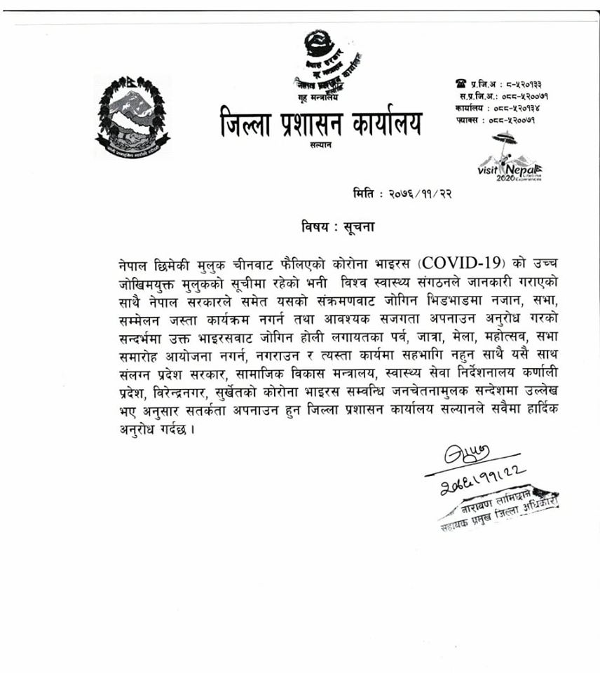 नेपाल छिमेकी देश चीनबाट फैलिएको कोरोना भाइरसको उच्च जोखिममा रहेको भन्दै प्रशासनले होली, जात्रा, मेला तथा महोत्सव गर्न रोक लगाएको हो ।